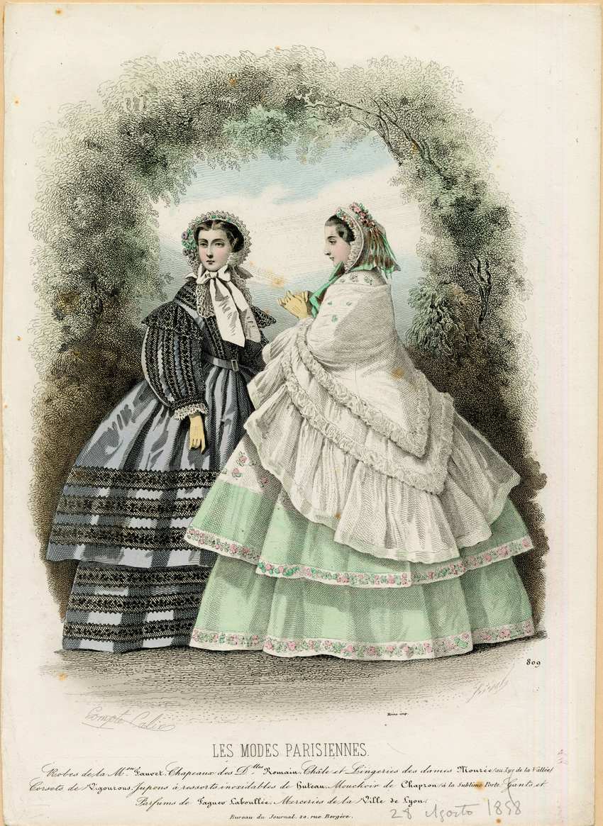 Two women are depicted in a wood. The woman on the left wears a bonnet with purple flowers and white ribbon. Her dress has long wide sleeves and a two-tiered skirt. The top is lavender and has black lace trimming in rows, almost covering the lavender. At her waist is a lavender belt. Her skirt has three rows of black lace stripes at the bottom of each tier. The woman on the right wears a white lace bonnet with pink flowers and green ribbon. Her dress has a two-tiered skirt edged in a floral pattern of pink and green on white. The dress is of a similar pattern of pink flowers and green leaves on white, with a wide mint green border at the hems of the tiers. Her dress is covered by a white lace shawl with a v-shaped hem coming to a point at the back, edged with a very wide ruffle.