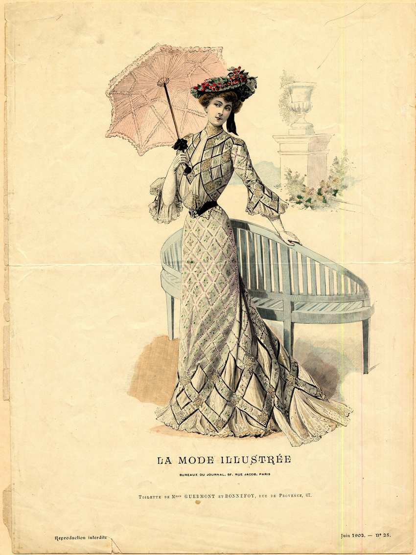 A woman in three-quarter view stands with her hand resting on the curved back rail of a garden bench. She models the French fashions of the Madames Guermont and Bonnefoy of rue de Provence, 67, in Paris. She wears a high-collared white blouse with a suit of white patterned in an overall diamond pattern, with pink and pale blue flowers in each diamond, and borders setting each one off. The blouse has lace forming the collar, and a upturned diamond lace motif at the front waist edge.