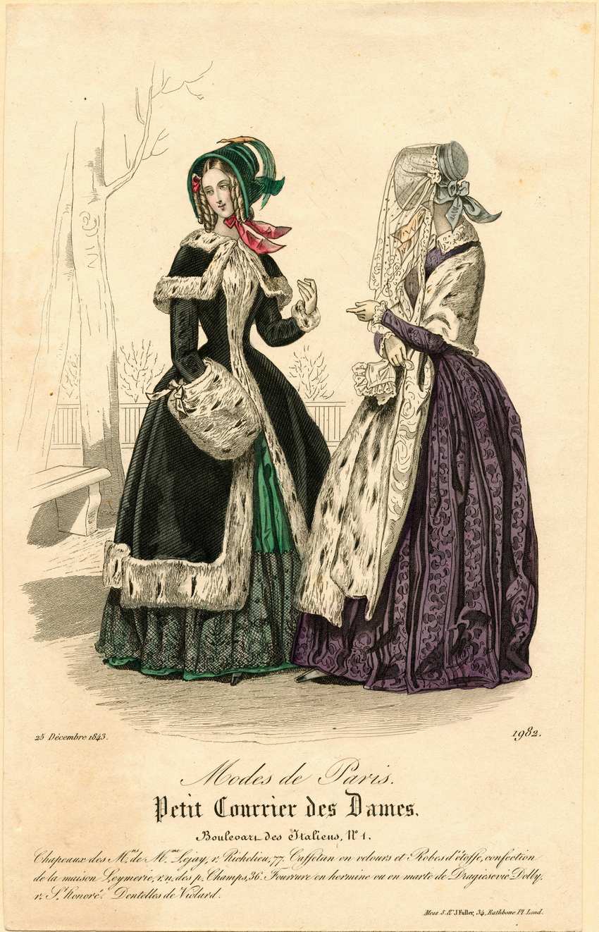 Two women stand in a park. The woman on the left wears a green bonnet tied with a pink ribbon, a green dress, and a black coat with ermine fur edging and a matching muff. Her coat has a short cape at the shoulders. The woman on the right faces away and wears a gray bonnet with a white lace veil draped over it. Her dress is purple with ivy or vine patterned fabric and a white lace collar and ruffled cuffs. She wears a long ermine wrap over her elbows, and holds a white ruffled handkerchief.