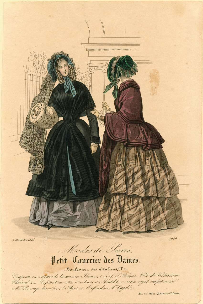 Two women stand outside. The woman on the left wears a blue bonnet with a long black lace veil at the back, a gray dress with a black coat and carries a spotted ermine muff. The woman on the right faces away and wears a green bonnet with ruffles and a purple mantelet edged with rows of narrow trim over a light brown striped dress with two wide bias ruffles at the hem.