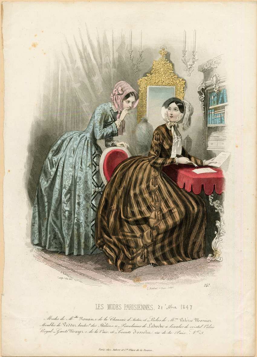 Two women are depicted in a library. The woman on the left leans over the back of the chair to whisper something to the other. She wears a light pink ruched bonnet with matching bows, and ribbons. Her dress is light blue with a brocade pattern. The sleeves are long and bell out at the ends. Down the front are large outlined diamonds of two rows of black ribbon connected by light blue flat bows. The woman on the right is seated at a desk in a red upholstered chair and is writing a letter with a quill. She wears a white bonnet with matching feather and ribbon. Her dress is light brown and dark brown stripes. It is long sleeved and has a narrow white collar. The dress has some sort of puffed decoration down the side of the skirt and on the sleeves that seems to be gathered light brown fabric with tassels. Behind the women is an ornate gold framed mirror, candle sconces, drapery, and a large vase. The desk has books on shelves, pigeonholes with papers, ornate foliate carved legs and molding, and a red cover with a scalloped edge.