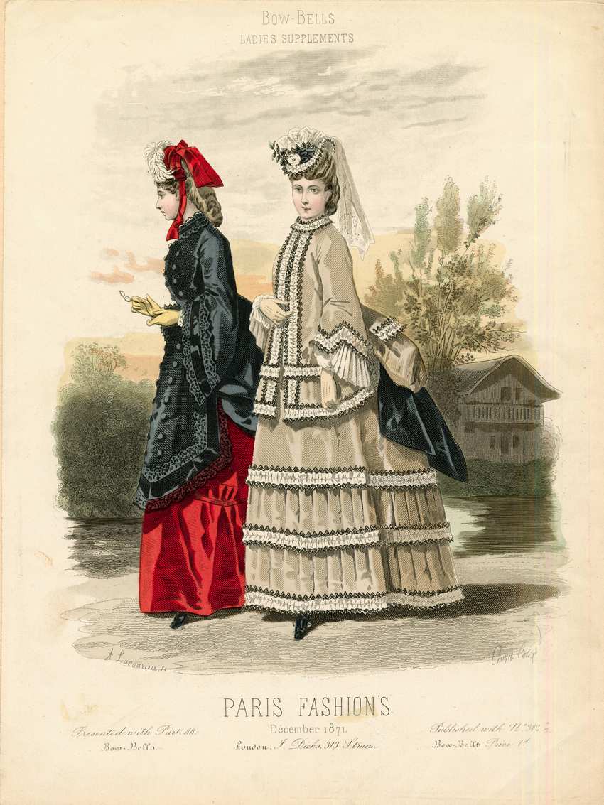 Two women walk outdoors. A house and trees are visible behind them. The woman on the left wears a red bonnet with a white plume. Her dress is red with a wide gathered flounce at the hem. She wears a black double-breasted mantelet, with black buttons and long bell sleeves. The hem and sleeves are edged with a wide band of black satin bordered with black lace ruffles. She holds a pair of eyeglasses in her right hand. The woman on the right wears a small white hat with a veil in the back and a white flower with black leaves in front. Her dress is beige with three rows of white ruffles with black edging and pleats in between at the hem. She has a matching jacket with a low collar and long bell sleeves. Her jacket is edged in the white ruffles. Both skirts have the elaborate back detailing of the bustle fashion.