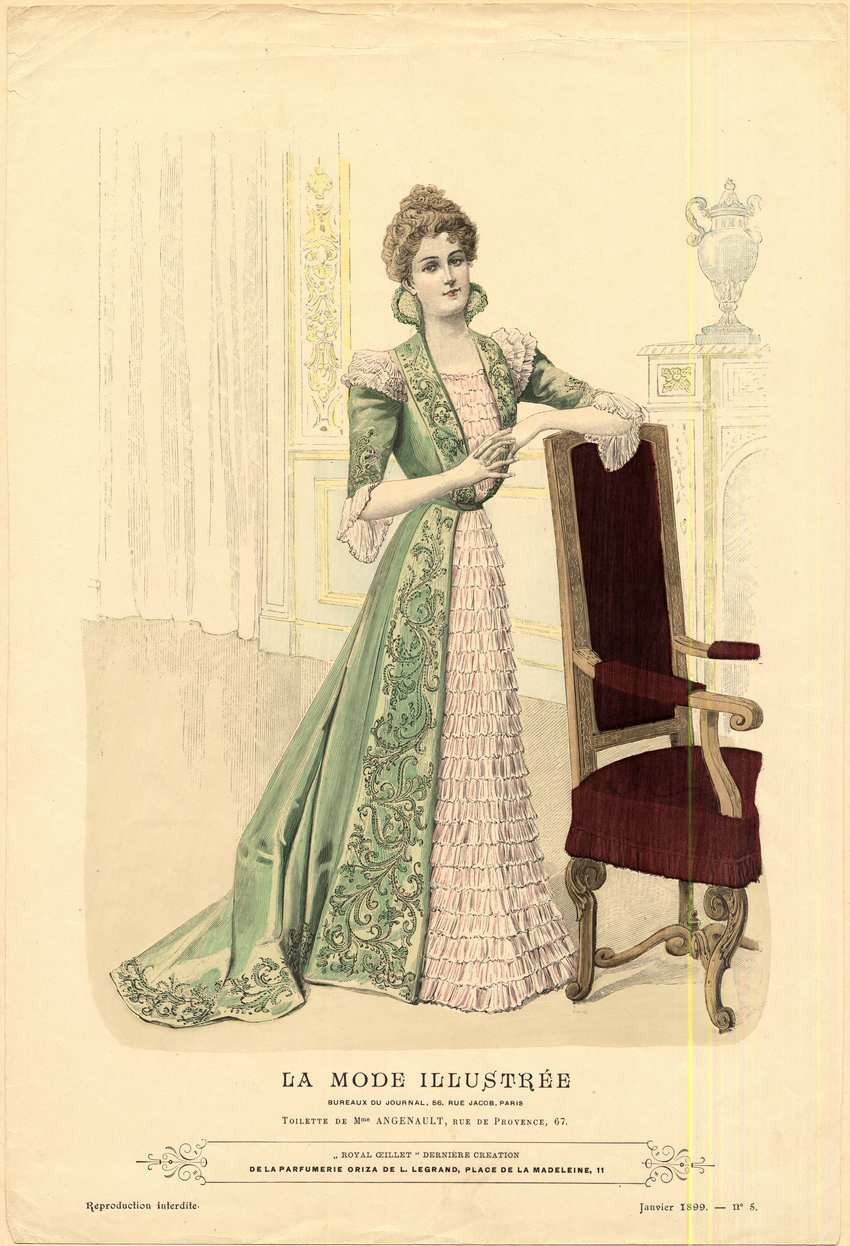 A woman is standing in an elegant room resting her arm on the back of a large red velvet upholstered chair. She is wearing a light green and pink dress. The light pink under-dress consists of many rows of tiered frills from the neck to the hem. The over dress is pale green with wide bands of floral brocade at the center front opening, increasing in width as they near the hem. Matching floral patterns adorn the hems of the elbow length sleeves, which end with pink ruffles, and trim the hem of the skirt at the back, where the skirt extends into a short train. The shoulders have three tiers of pink ruffles, and the collar is very high of pink with a green edge, forming a raised frame for her face. Her hair is done up high on her head in curls.