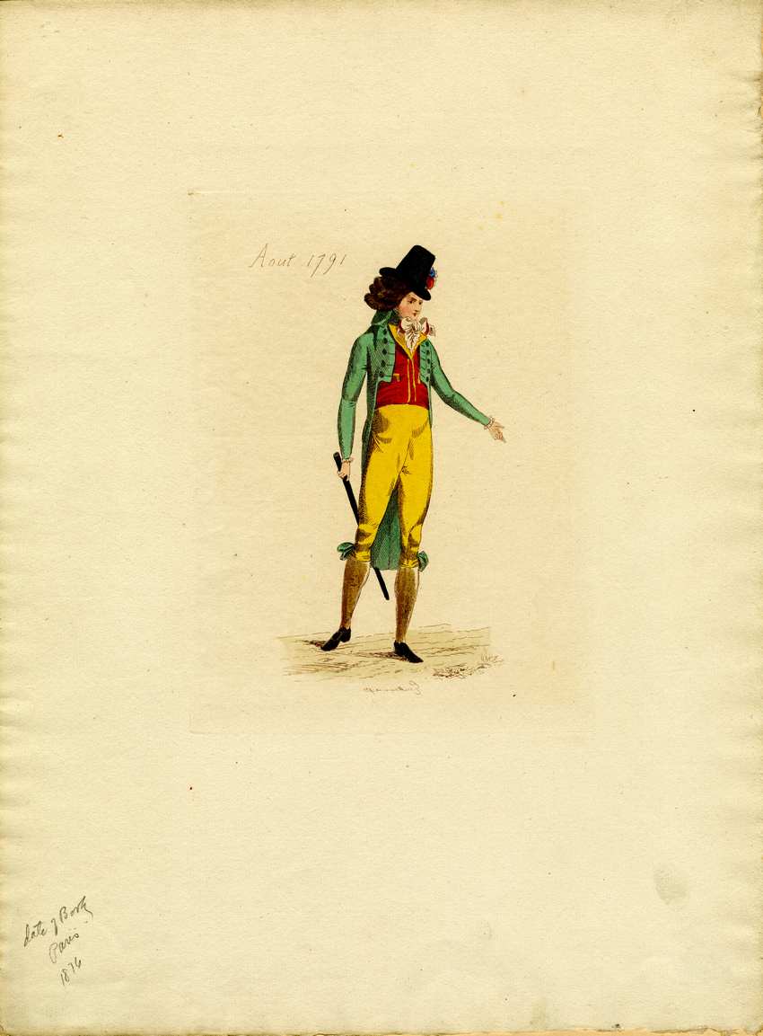 A gentleman with a black hat and a dark brown, curly wig is standing, with his left arm outstretched. There is a red and blue cockade on the left side of his hat. He is wearing a bright green cutaway jacket with long tails over a red waistcoat. His jacket has a very high standing collar. His waistcoat has gold lapels and gold bands on the center front and the pockets. His elaborate bow (ribbon work) tied around his neck. He is wearing yellow breeches with green bows at the knees with brown hosiery. His black shoes have large square gold buckles. In his right hand, he is holding a walking stick behind his back.