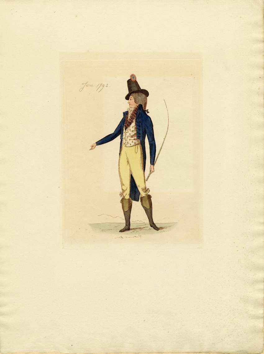 A profile image of a man looking to the right with his right arm extended. He is wearing a black top hat with a red and blue cockade at the top. He wears no wig, but his straight hair is tied into a queue in back. His cutaway tail coat is dark blue with a tall turn over collar. His waistcoat is white, patterned with yellow fleur-de-lis. His cravat is tied very high, almost to his chin. He wears a red and black striped scarf around his neck, tucked into his waistcoat. His pale yellow breeches are tucked into black boots with brown tops. He holds a whip in his left hand.
