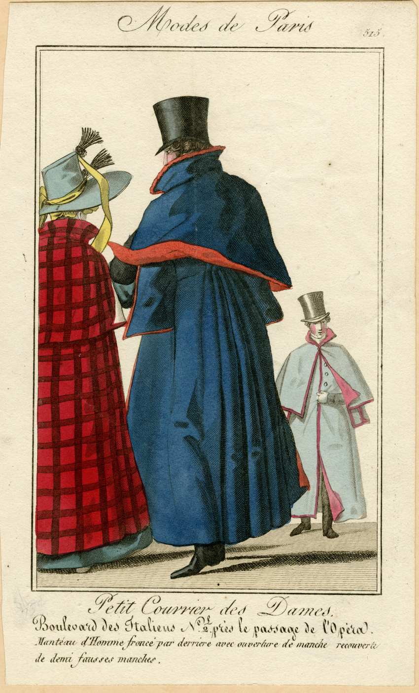 Central to this illustration for Petit Courrier des Dames is an overcoat for men, circa 1818, France. Shown from the back, this dark blue overcoat has tucks at the back waist falling in loose folds to the ankle. At the collar is a waist-length cape over the body of the coat. The collar is high and half sleeves can be seen below the cape. The cape, coat, and collar are all lined in red. He wears a black top hat, black jacket, and black boots or shows. Behind him is another gentleman wearing a similar coat, showing the front view of the garment. The coat has three buttons at the center front above the waist. The gentleman’s trousers are strapped over the foot. At the left of the plate is a woman in a similar overcoat in a bright red and black plaid, lined in white and also seen from the back. The woman wears a blue dress, a tall-crowned, wide-brimmed pale blue hat with long yellow ribbons and black feathers.