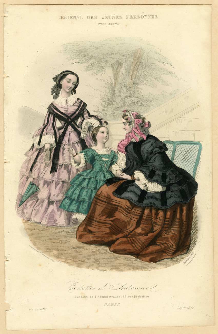 A young woman and a girl visit with an older woman who sits on a park bench. The woman on the left wears a lavender dress with a long skirt with four ruffled tiers. The bodice is styled like a fichu with bold black ribbons crossing in front. The bodice has dropped shoulders, a jewel neckline with a wide falling collar of white lace, and pagoda sleeves over white full puffed sleeves gathered in below the elbow. Black ribbons also stream down the sleeves from the dropped shoulders.