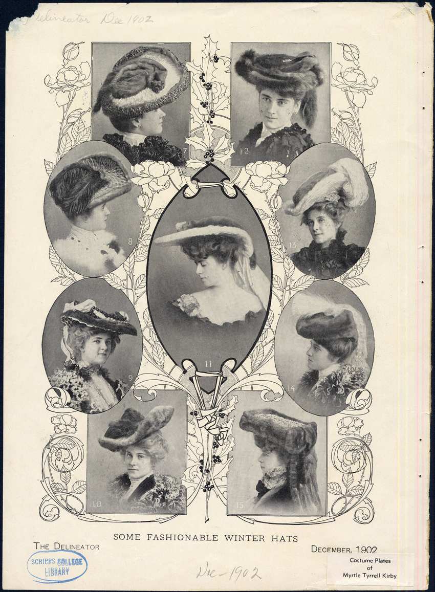 Nine fashionable winter hats are displayed in rows, numbered 7 to15. in individual square or oval pictures surrounded by garlands of roses, leaves, and holly. Each woman is shown in a head and shoulders view. Picture no.7 shows a woman looking right, with a flat hat of white fur, with a curled up mink, complete with head and tail, as the crown of the hat. The hat has a brim trimmed with short speckled fur. The woman is wearing a small round earrings, a white high necked blouse, and a ruffled boa.
