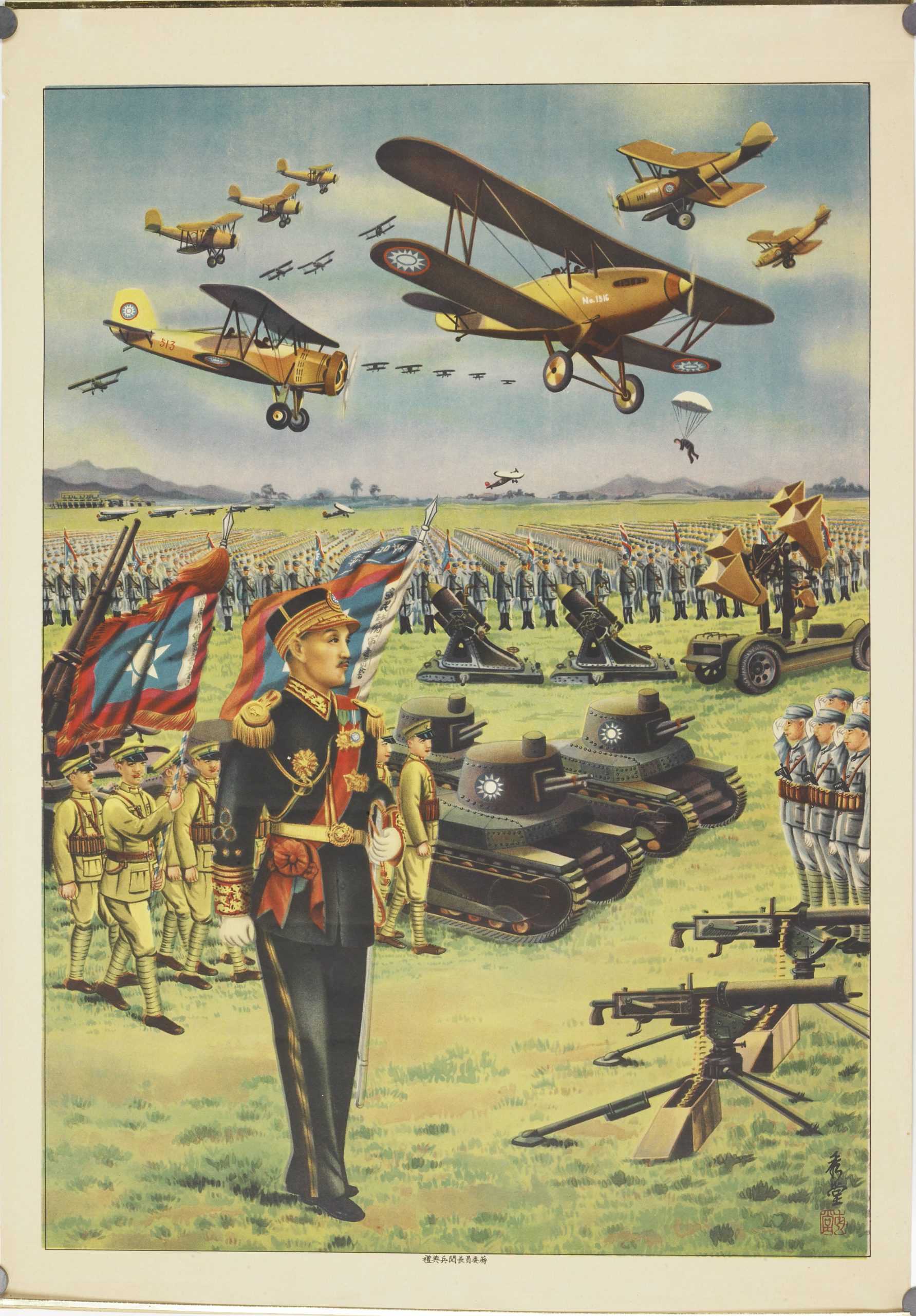 The poster celebrates the Chinese army during the Second Sino-Japanese War (1937-1945). The illustration shows Chiang Kai-shek in full dress uniform, inspecting troops, fighter planes, and tanks.