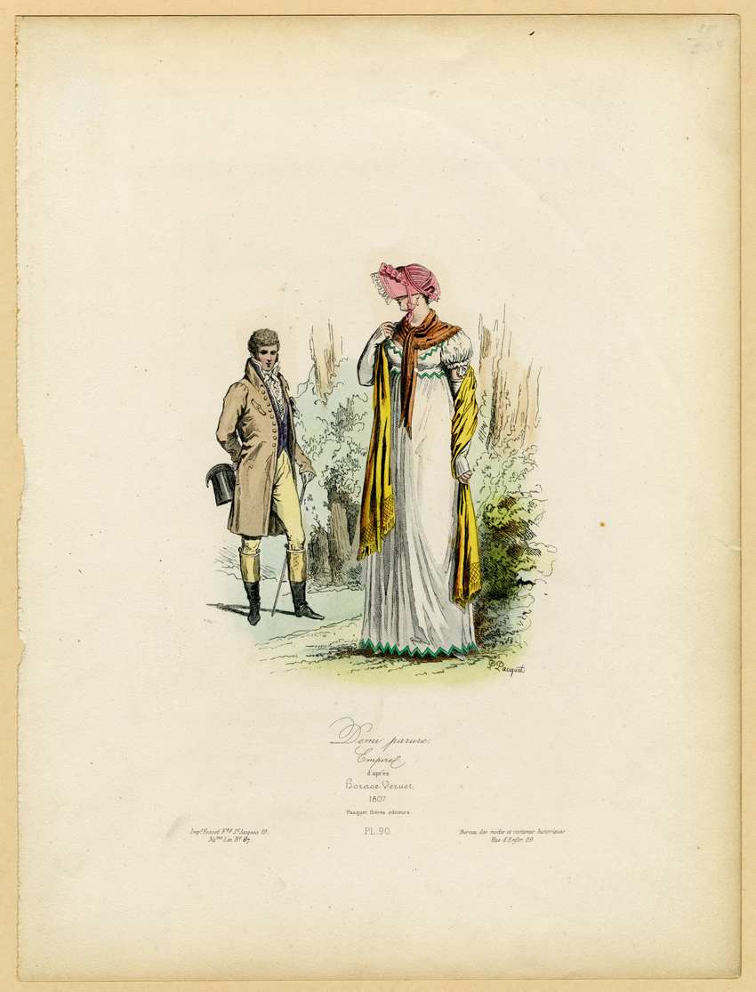 A woman and man stand in a grove. Drawn during the height of the Napoleonic Empire, this illustration shows the woman and man in empire style. The woman’s empire-waist ‘half dress’ is white with short puffed sleeves, and has green zigzag trimming along the neckline, waist, and hem. The long visor of her poke bonnet shields her face from the viewer as she turns toward the man. Her pink bonnet has a striped headpiece, the visor is trimmed with a white ruffle, and the ties issue from a series of bows down the side of the brim to tie beneath the chin. A fringed rose pink scarf is tied loosely at her neck, and she carries a long yellow shawl edged with fringe and a cross-hatch patterned band.