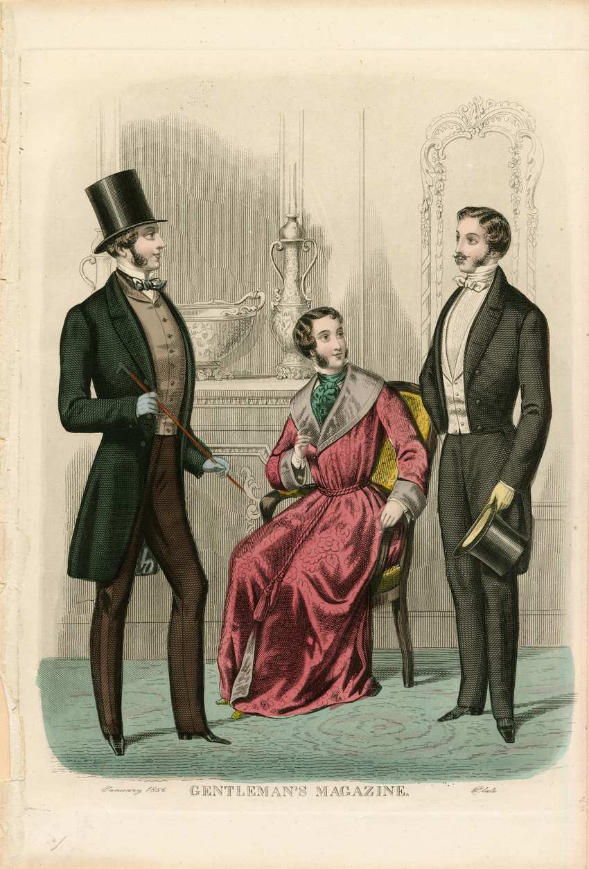 Three men are depicted in a parlor. The man on the left wears a top hat and a daytime suit. He wears a green bow tie, a light brown vest, brown trousers, and a dark green frock coat. He wears light blue gloves and holds a cane in his hands. The man in the center sits in a gold upholstered arm chair. He wears a green cravat, a white shirt, and a maroon dressing gown. The lapels, cuffs, and lining are gray, and it is tied with a cord at the waist. The man on the right wears a dress suit. He wears a white shirt, cravat and vest, with black trousers and dress coat. He holds his top hat in his left hand. This gentleman has a small pointed mustache, and all three wear chin length sideburns.