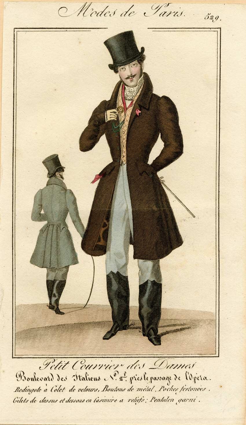 Two men in redingotes from 1828 or 1829. The man on the right faces forward and wears a brown coat with a pinched waist and gray trousers. He wears tall black boots and riding spurs. In his left hand he holds a short stick that could be a riding crop. His coat has leg-of-mutton sleeves and two side pockets. Showing out of his right pocket is a pink handkerchief. A matching pink ribbon adorns his lapel. The lining of his jacket is made of brown satin. He wears a pale yellow vest that is lined with red and a white shirt with a white spotted cravat. He holds a quizzing glass or monocle in his right hand that is attached to a thin green ribbon. He wears a black top hat. The man on the left is in the background, walking away with his back turned. He wears tall black boots with spurs, gray trousers, and a gray redingote in the same style as the first man, with pleats in the back. He carries a thin cane or walking stick and wears a black top hat.