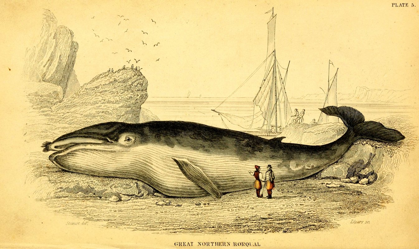 This image is part of a collection of whale drawings that appeared in the 1843 book “Whales” by Roger Hamilton.