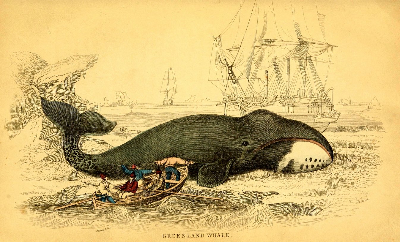 This image is part of a collection of whale drawings that appeared in the 1843 book “Whales” by Roger Hamilton.