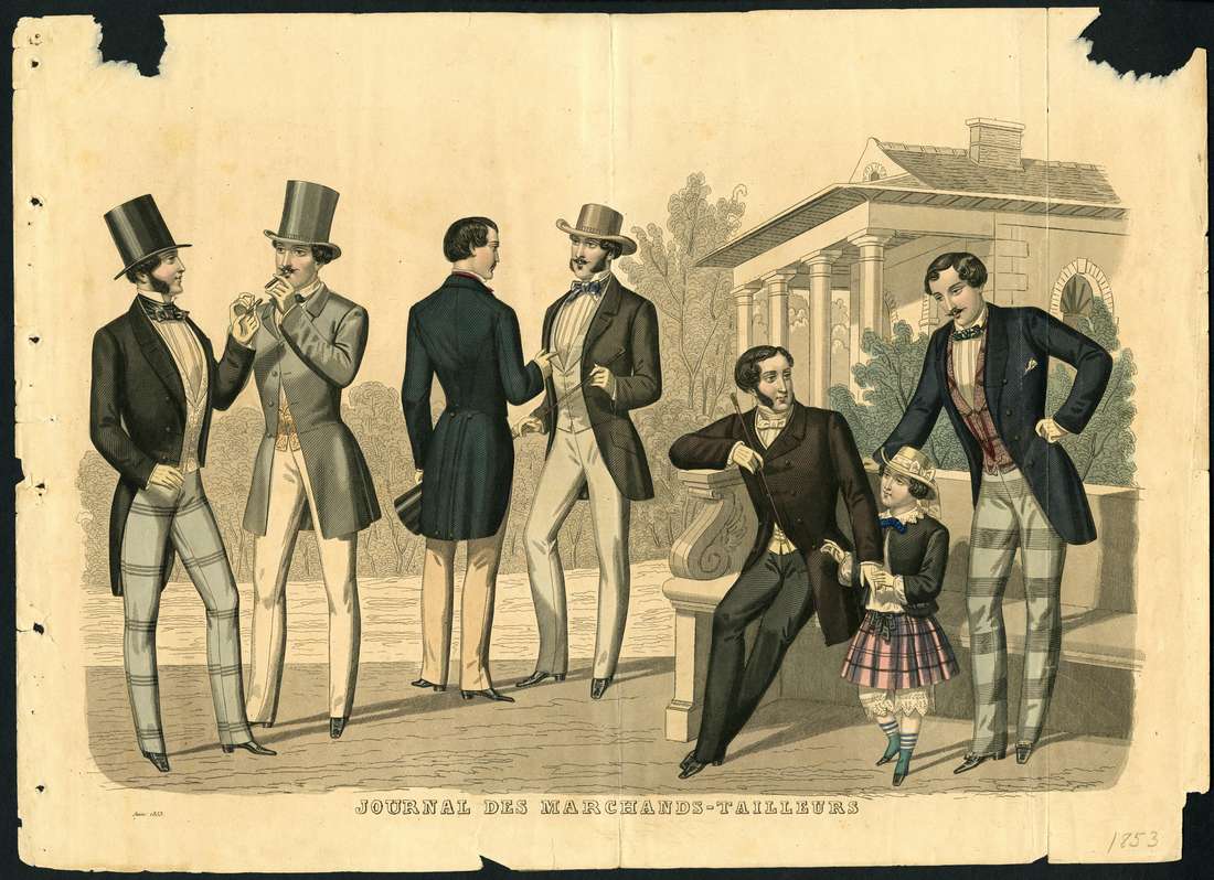 He wears gloves, black and green buttoned boots, and blue striped stockings. His hair is short and curly, and he wears a shallow-brimmed straw hat trimmed with white ribbon. The last man on the right wears horizontally striped trousers in gray and black wide stripes. He wears a white pleated shirt and striped cravat, and a waistcoat with a wide red and black Tattersall plaid pattern on a light brown ground.