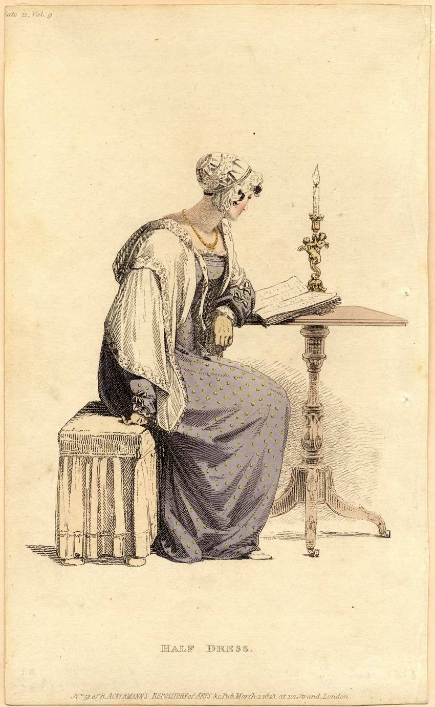 A woman wears a purple dress with yellow dots with a low neck and long sleeves. The sleeves have white ruffles at the cuffs and two white bows at the wrists. The neck has two rows of white trim and a white ruffle. The woman wears a white, lace-edged shawl, buff-colored gloves, and white shoes and stockings. She has a lacy, white cap and a gold necklace with a gold flower. The woman is seated on an upholstered bench. She reads at a small, wooden pedestal table that holds an open book and a candle in a gold candlestick made of two cherubim on a pedestal.
