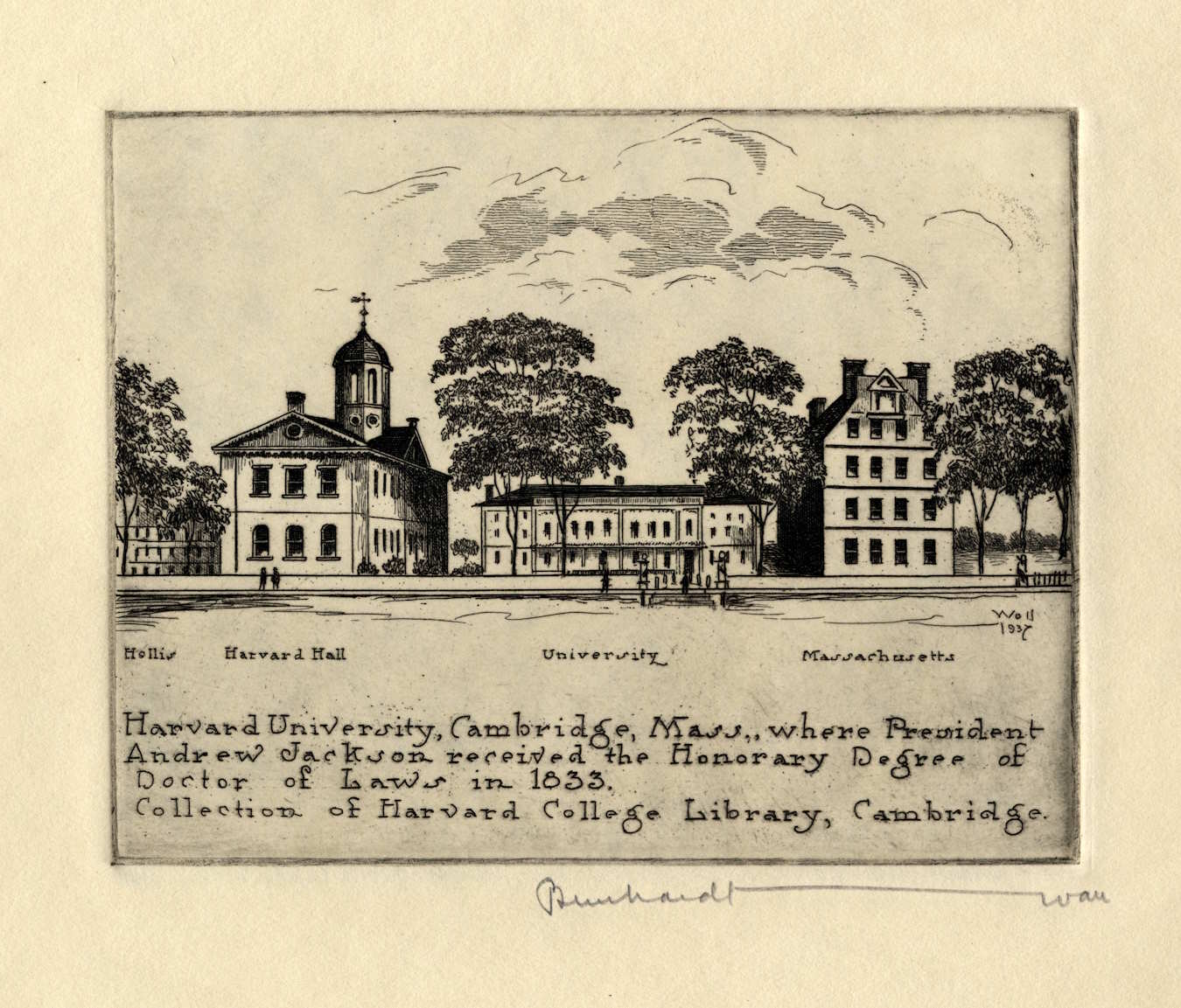 This etching presents the front of some of the college buildings at Harvard University at the time Jackson was honored in 1833. The Wall name appears at the bottom of the drawing with the date 1937; Wall signed below the etching. The inspiration image comes from the collection of the Harvard College Library.
