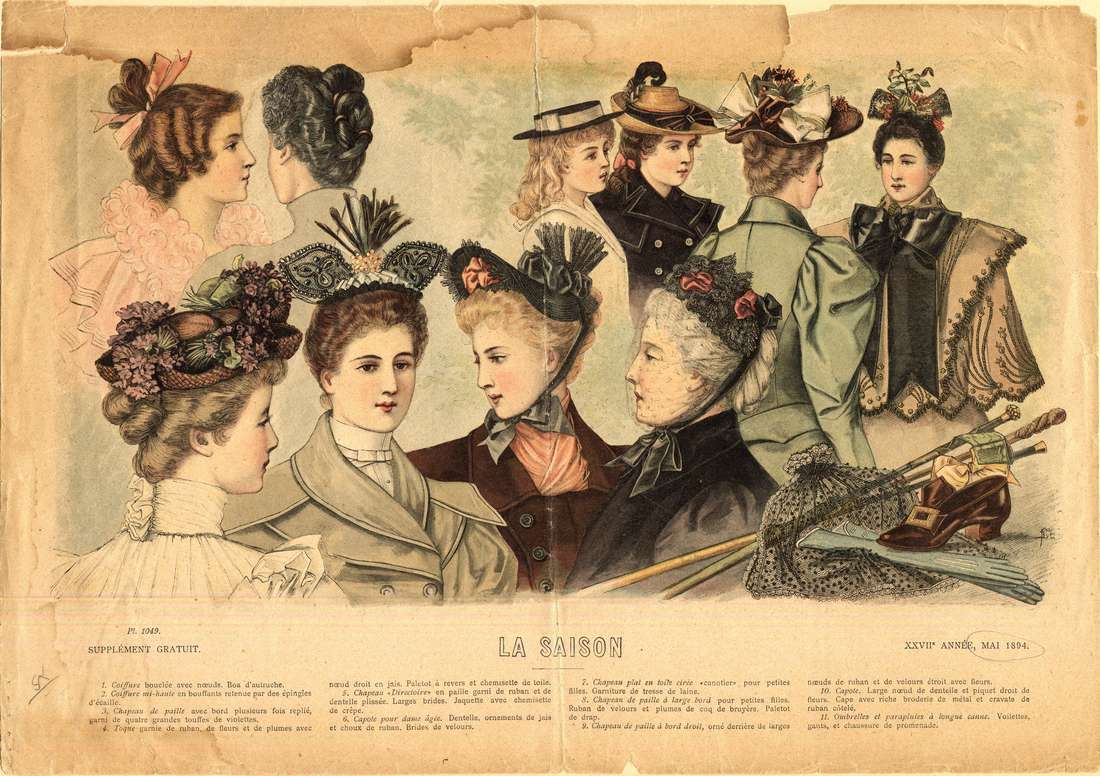 The last woman wears a black coat and a small black lace cap, tied with black ribbon. The cap has a light spotted veil, and has two small poufs of rose pink ribbon. Her gray hair is also dressed in a braided bun. In the bottom right hand corner of the picture is a maroon high heeled buckled shoe, a pair of light blue gloves, a pink hair bow, three walking sticks, and a black spotted lace veil.