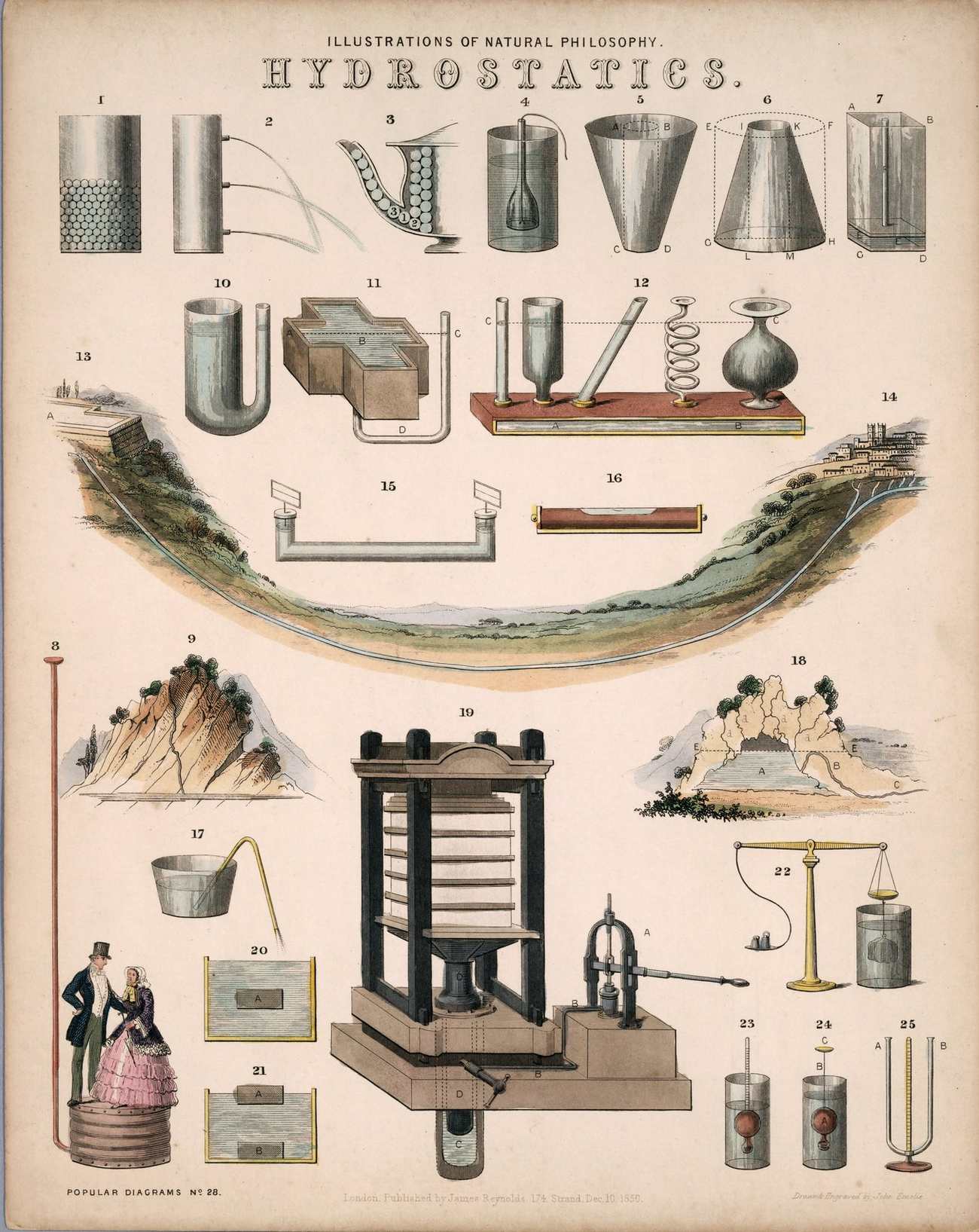 Emslie describes this vintage science poster as follows: “This department of science treats of the pressure and equilibrium of liquids, the most remarkable property of which is equality of pressure.”