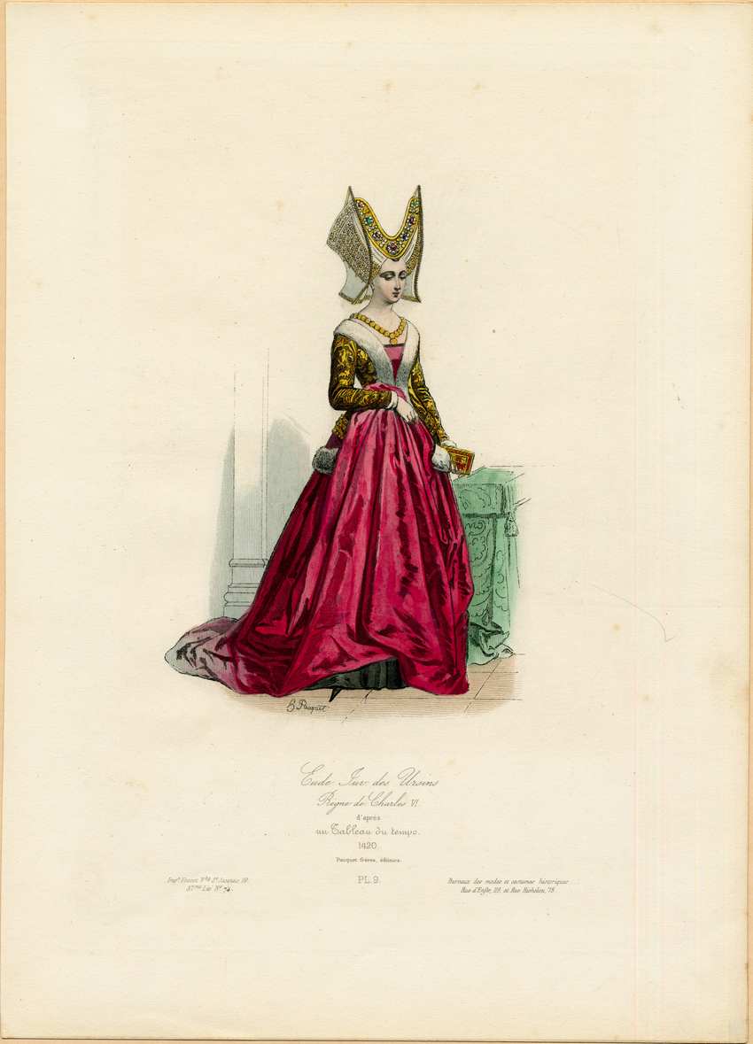 A woman in the costume of Eude Inv. des Ursins. She wears a magenta sideless surcoat dress with fur edging. Her underdress is ornately patterned and gold with fur cuffs, and her petticoat is black, with one black pointed shoe showing. A small section of her elaborate gold belt, worn below the waist, is visible on her right hip. She holds up the long overskirt to the front of her waist with her left hand. She wears an ornate horned headdress decorated with gold and gems, covered with a transparent white short veil edged in gold. She wears a gold necklace of linked circles with a circle pendant, and stands next to a table covered with a green cloth, holding a red and gold book.