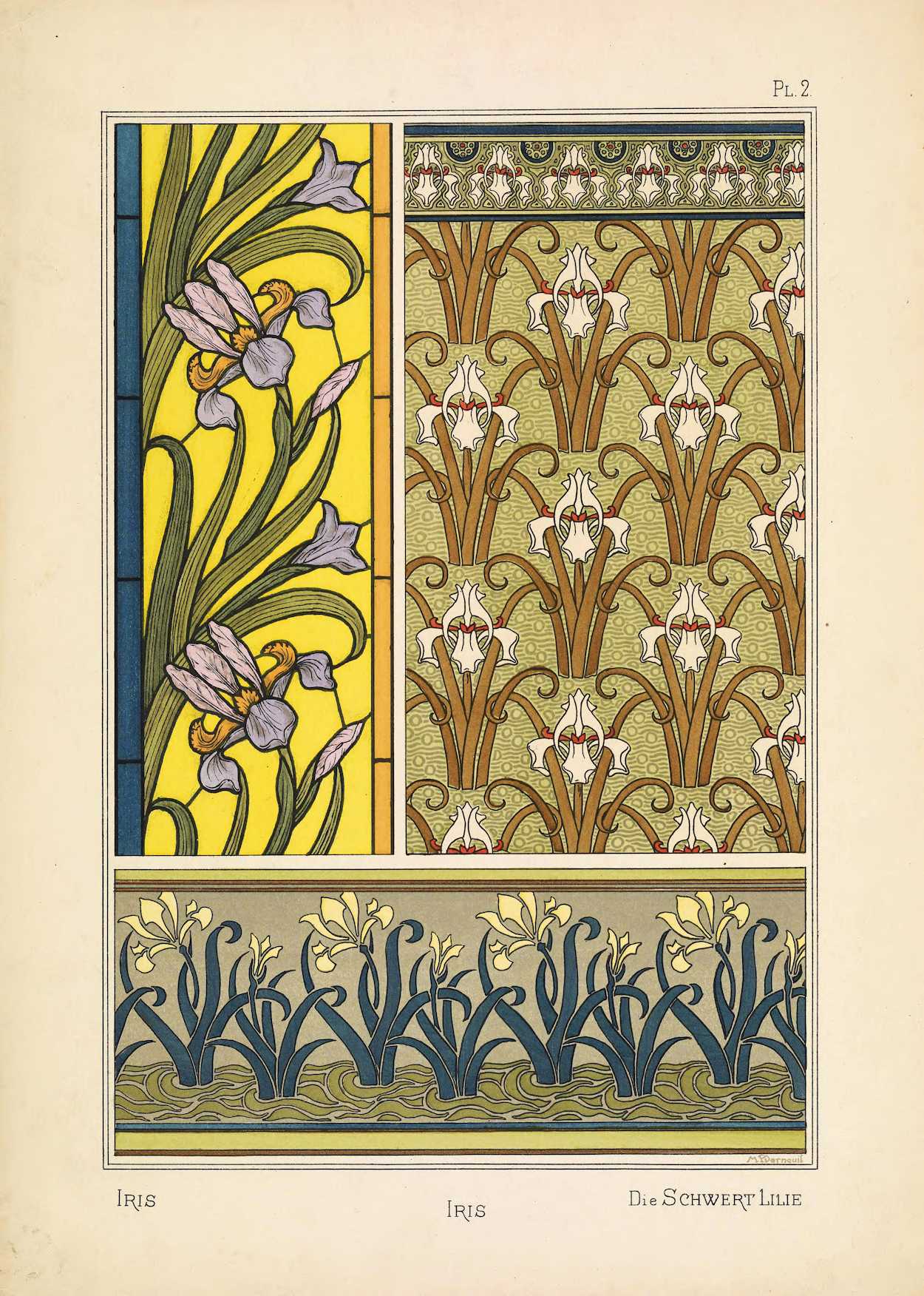 Iris’s were a popular Art Nouveau flower. The first print is of Verneuil’s botanical drawing of the Iris. The second print is the decorative Art Nouveau floral patterns created with this flower.