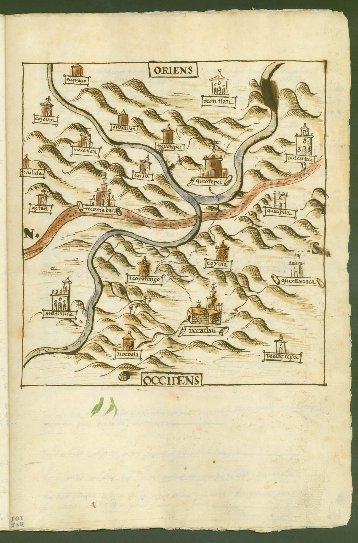 This map from Ixcatlán, Santa María, in the present-day state of Oaxaca, Mexico, is from the Relaciones Geográficas collection in the Benson Latin American Collection at the University of Texas at Austin.