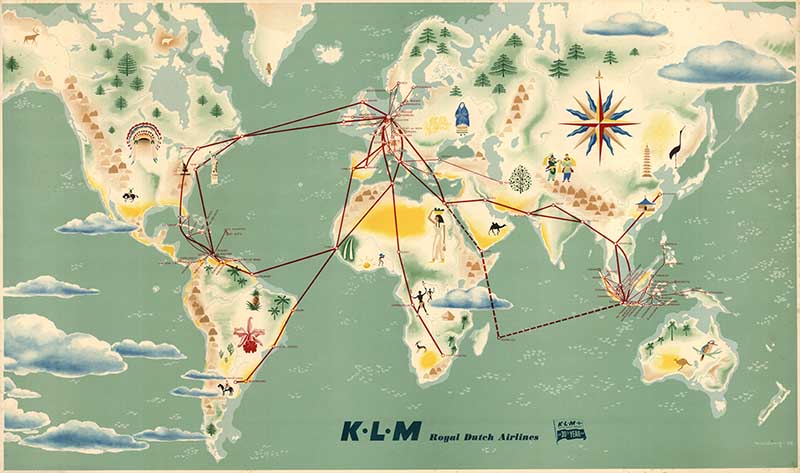 Vintage advertisement for KLM Royal Dutch Airlines. The map illustrates the airline’s global routes, which connected the Netherlands to important economic regions around the world, with iconic cultural and natural illustrations on each continent.