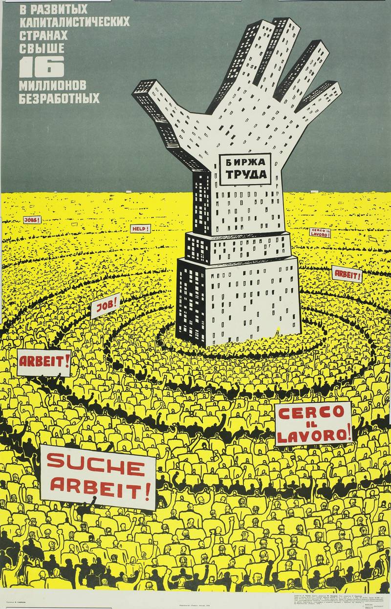 The Labor exchange of the Union of Soviet Socialist Republics is surrounded by the unemployed masses. It is depicted as the central solution with a tag-line that says, in effect, in well developed capitalistic states more than 16 million people are jobless. Signs held by the masses are written in German, English and Italian.