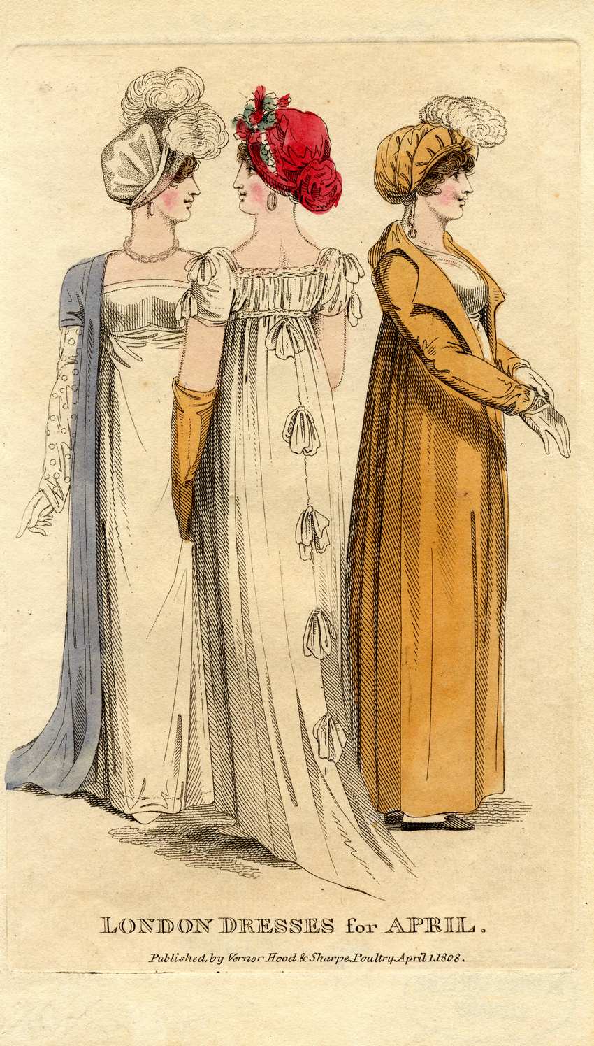 Three women in London dresses for April. The woman on the left stands facing the viewer with her head is in profile. She wears a white bonnet with two white feathers on top and white, oval earrings and a matching necklace. Her white, full-length dress has a gathered empire waist and long, dotted, white sleeves. She wears a gray-blue coat with short sleeves and she wears white, pointed shoes.