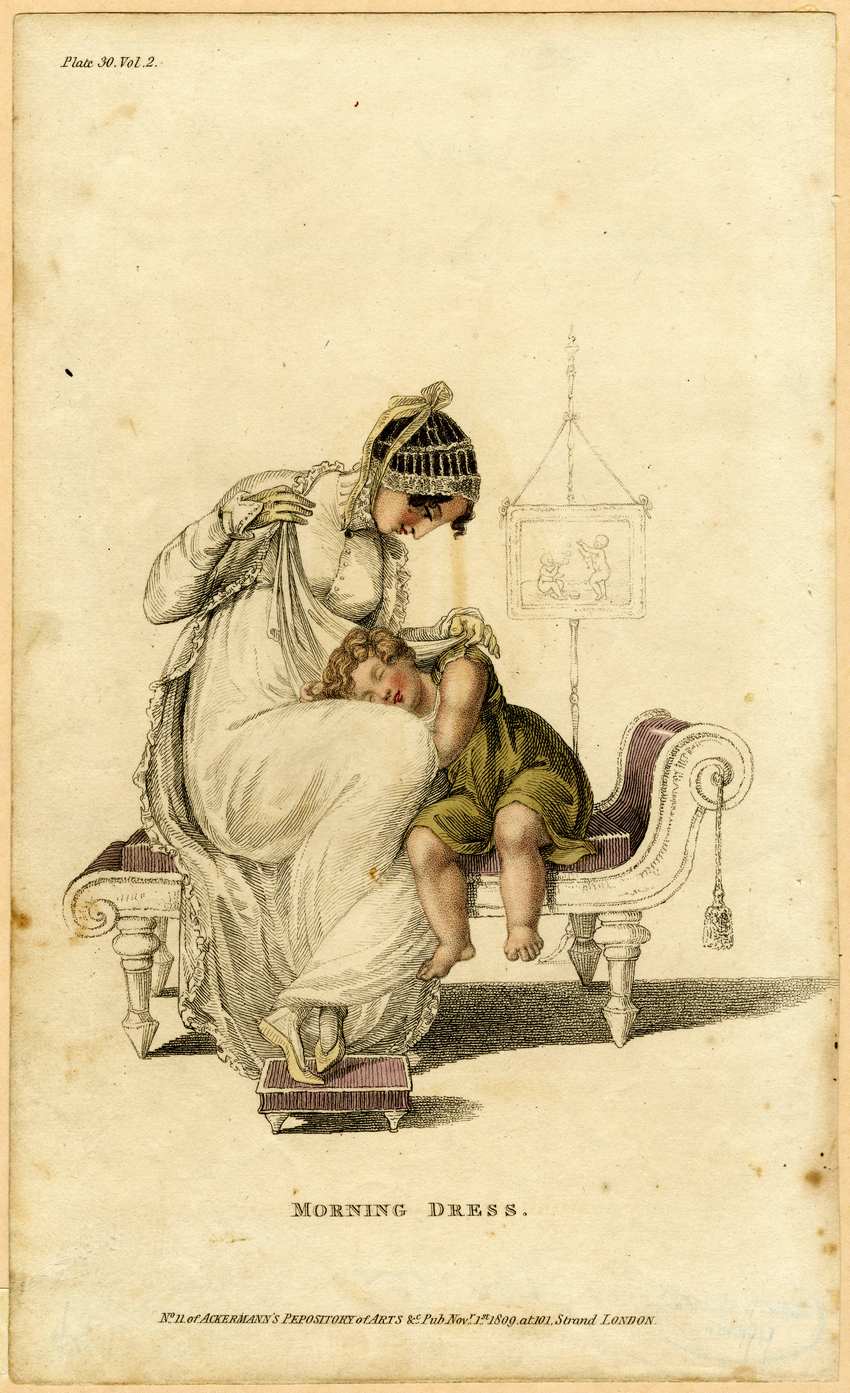 A woman and sleeping child sit on an Empire style chaise lounge in London morning dress for 1809. The woman rests her feet on a small matching foot stool. The woman wears a long, white, unstructured dress, with an Empire waist. The bodice has a high standing collar with a ruffle and has a row of small white buttons fastening the center front. Over her dress is a white pelisse coat with ruffled edges and structured cuffs, which reach down over her hands in points. Her dark curly hair is worn under a snugly fitted white net cap with a yellow bow at the back. She wears pale yellow gloves and pale yellow slippers. Next to her on the chaise lounge is a sleeping child wearing a moss green tunic with short cap sleeves. The child is barefoot and bare-legged. In the background is a faint illustration of two children blowing bubbles and playing, hanging in a frame on a stand. The chaise has a large tassel hanging from the curved back. Te woman has a kerchief or wrap in her hands and appears to be either tucking it over the sleeping child, or pulling it loose from beneath the child.