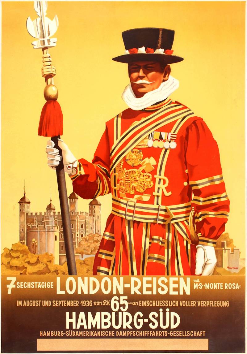 Vintage German travel poster from 1936 promoting trips to London, featuring a Yeoman Warder, also known as a “Beefeater,” a ceremonial guard at the Tower of London.