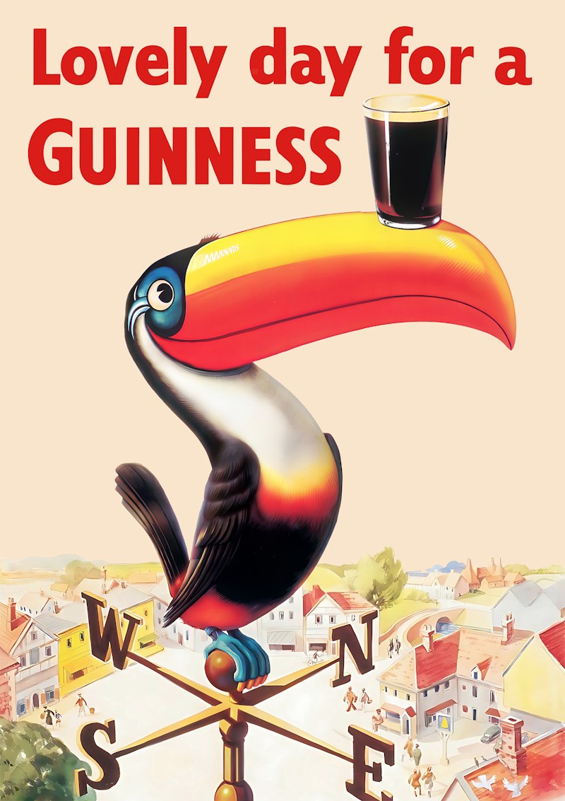 This image shows a collectible, specifically a vintage advertising poster for the Guinness beer brand, featuring the iconic toucan. The poster features the famous slogan “Lovely day for a Guinness” and the toucan is positioned on a weathervane in a village scene.
