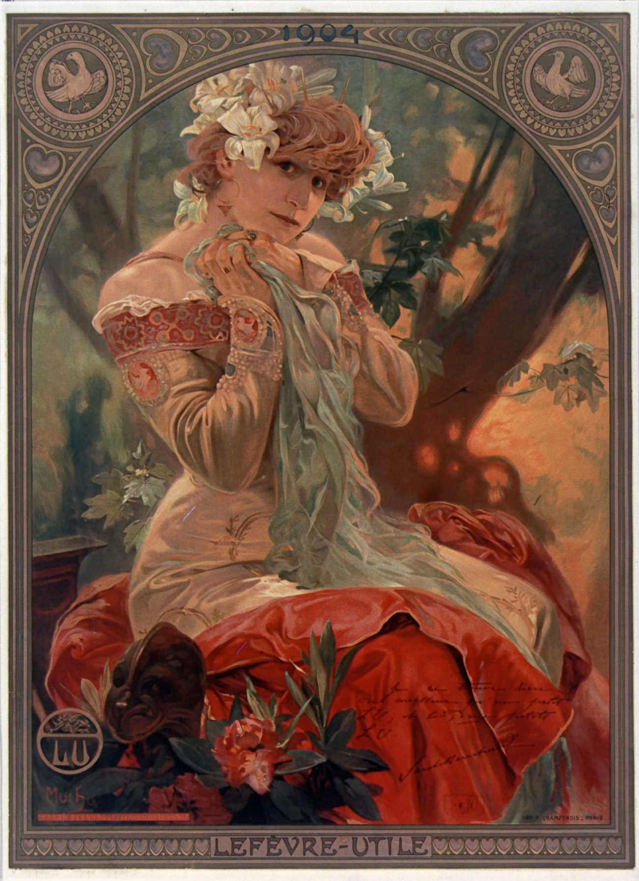 Alphonse Mucha created famous Art Nouveau posters and packaging for the company, advertising their biscuits. In English descriptions, the advertisements are commonly referred to by the full name, such as the “Lefèvre-Utile Biscuits” or just “LU Biscuits” advertisement.
