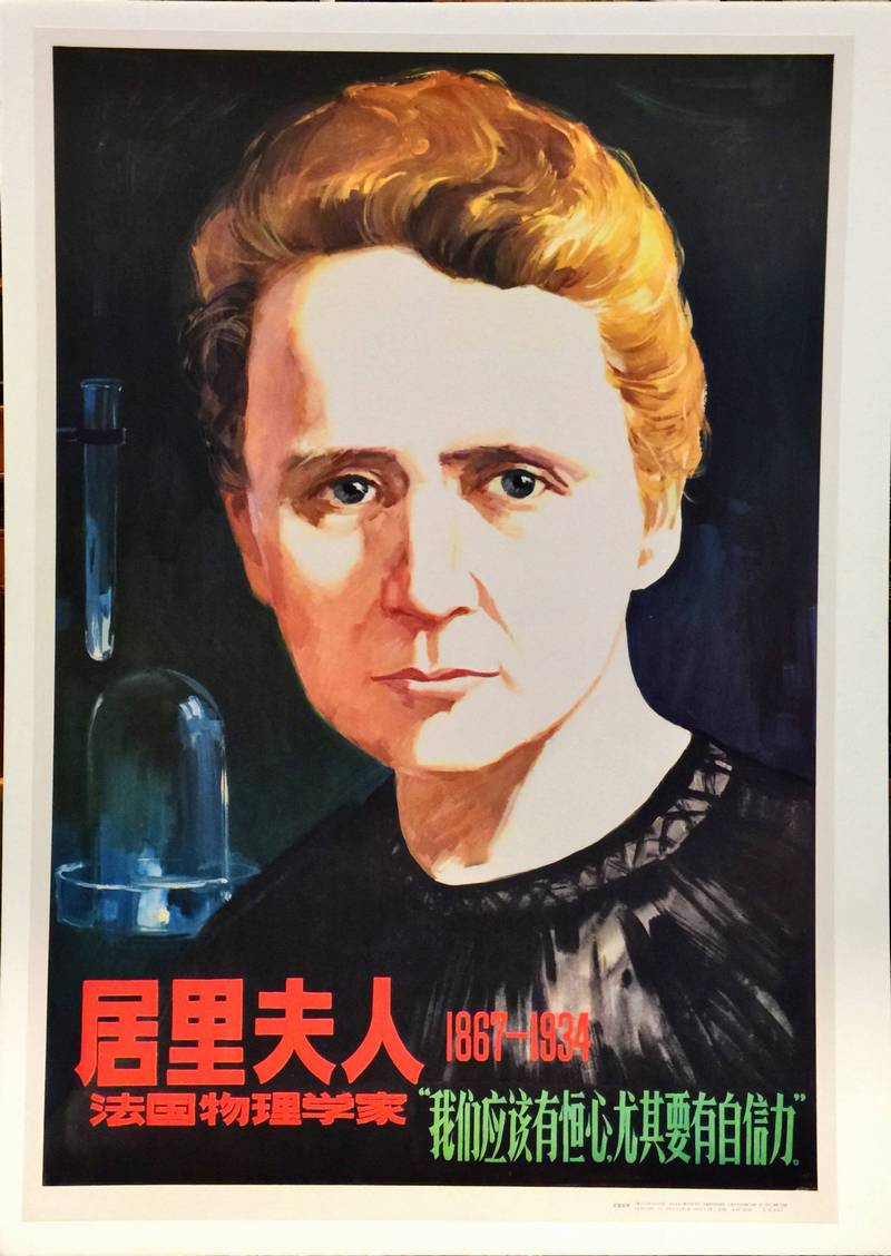 Chinese propaganda poster of Marie Curie (1867–1934), created by the author Shen Shaolun and originally published by the Shanghai People’s Fine Arts Publishing House in June 1979.