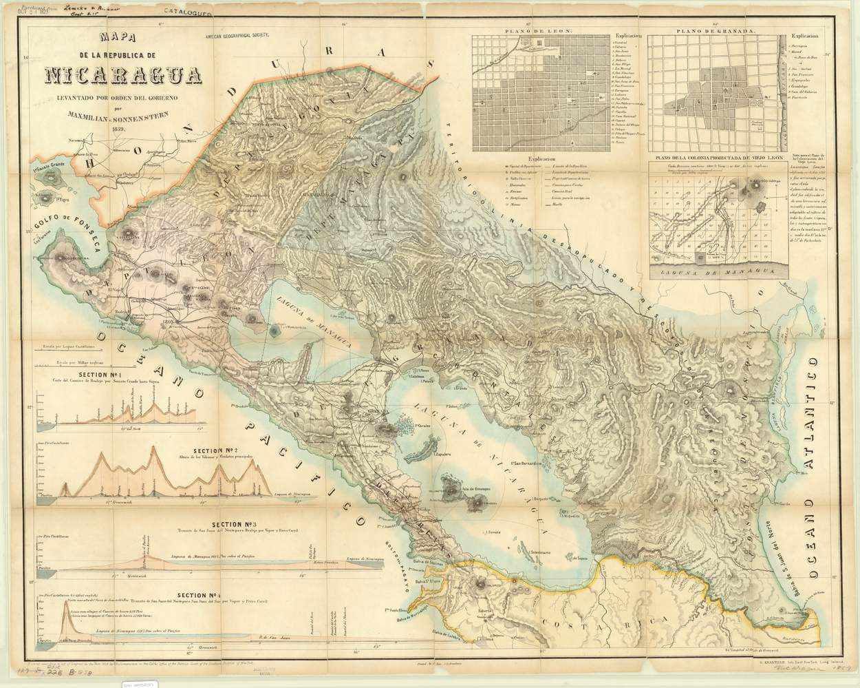 The map contains four cross sections, showing the heights of mountains and volcanoes. Three inset maps depict the towns of León, Granada, and Viejo León (the old city of León that was abandoned by its inhabitants following the earthquake of 1610 and relocated to the site of present-day León). The map shows the international borders with Honduras and Costa Rica, department borders, roads, planned railroad lines, rivers, mines, ruins, and the Atlantic and Pacific Oceans.
