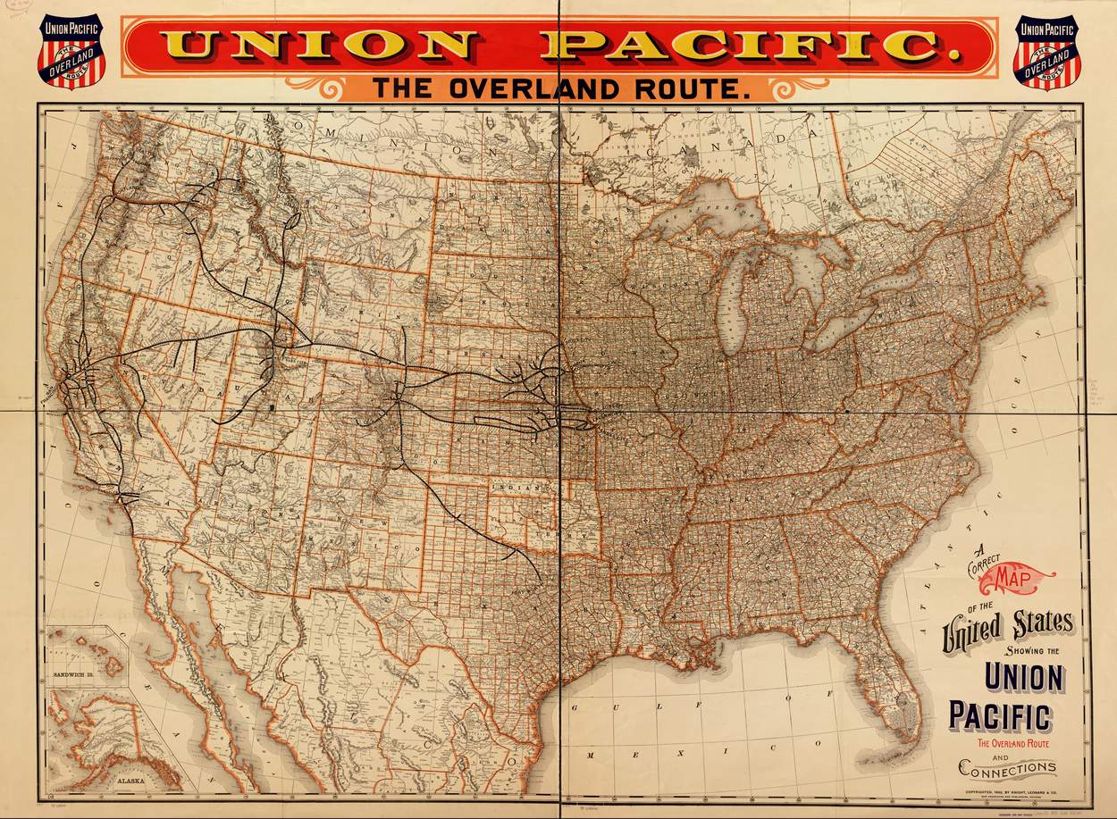 A correct map of the United States showing the Union Pacific, the overland route and connections. It shows drainage, cities and towns, state and county boundaries, railroads, and railroads under contruction.