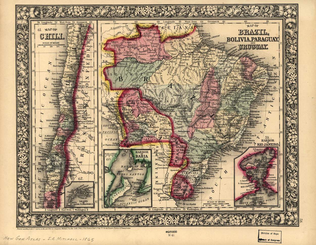 Relief shown by hachures. “Entered according to Act of Congress … 1870 by S. Augustus Mitchell, jr. … Pennsylvania.” Maps include insets of “Harbor of Rio Janeiro,” “Harbor of Bahia,” and “Island of Juan Fernandez.” Decorative border picturing grape vines surrounds the two maps. In margin : “69.” From: Mitchell’s new general atlas. Philadelphia : S. Augustus Mitchell, 1871 or 1872.