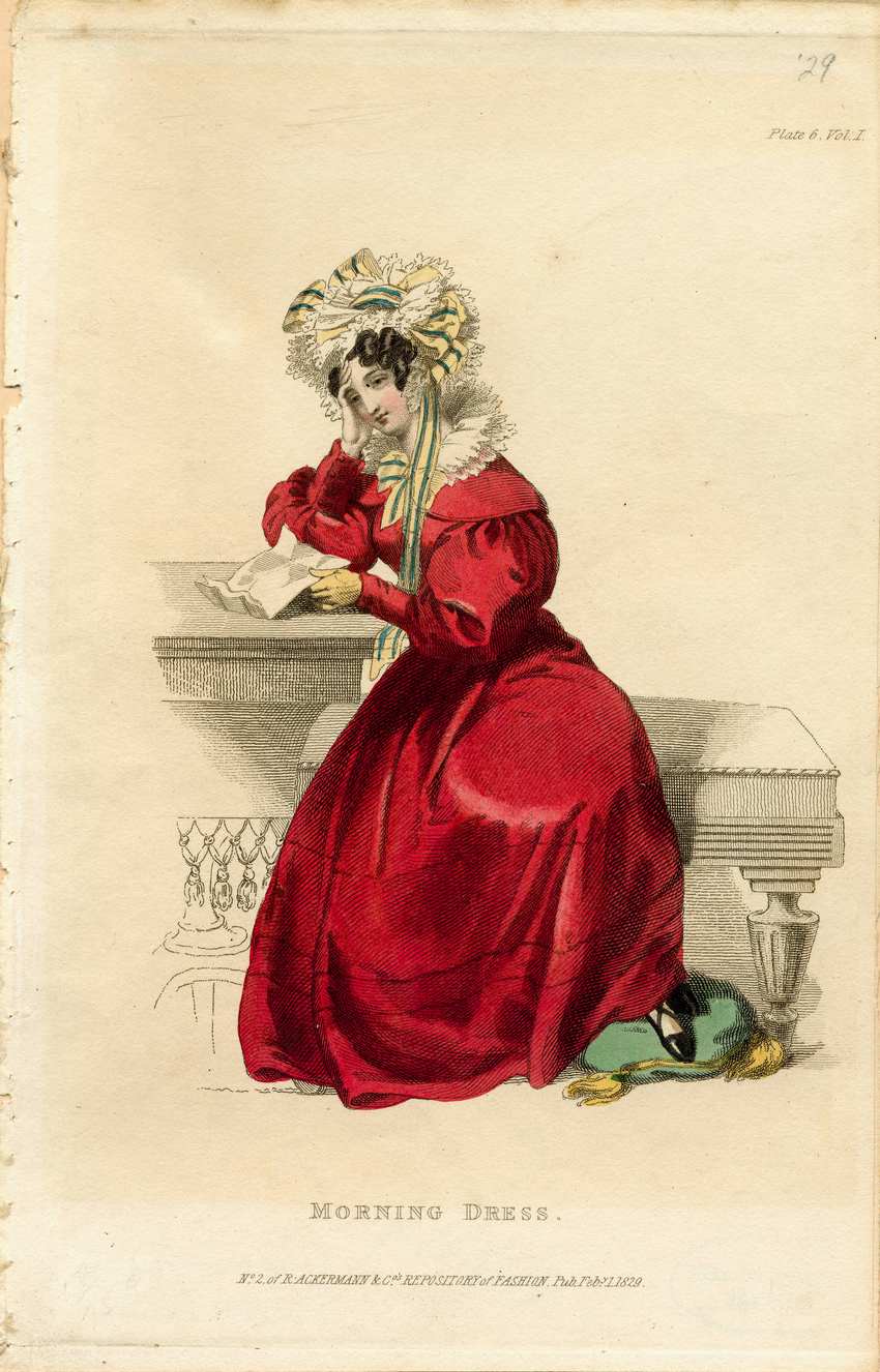 A woman wears a morning dress from 1829. The dress is red with long-sleeves and a wide collar that covers her shoulders. The sleeves are in the bishop style. There are small red buttons on the cuffs. She wears black ballet slippers and yellow gloves. Around her neck she wears double ruffs of white lace with jagged edges. She wears a yellow and green striped bow at the neck. She wears a large bonnet head piece that is made of white lace and the same yellow and green striped ribbon. She reads a two-page letter and rests her head in her right hand. Her foot rests on a green pillow, edged in gold with gold tassels on the corners. She sits on a rectangular bench and leans on a table. Along the edge of the table top hangs a criss-crossed fringe with tassels.