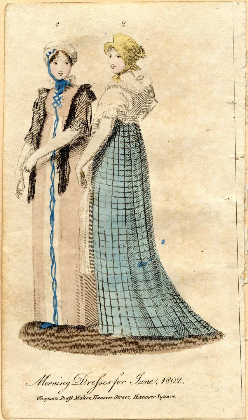 Two women wear morning dresses for June 1802. The woman on the left wears a soft pink dress with long skirts, short sleeves, an empire waist, and a high, ruffled neck. A white placket laced with blue adorns the bodice and is complemented by a white strip down the front of the skirt that is similarly decorated in blue. The woman wears blue shoes and a white, turban style hat trimmed with blue flowers and tied with a blue bow. She wears a ruffled, black gauze wrap around her shoulders. Her left hand appears to be pulling a short, white glove over her right hand. The woman on the left wears a long, empire waist, blue checked dress with short sleeves and a small train. She wears a long ruffled white shawl around her shoulders, and a yellow hat tied with a yellow bow. Her shoes are flat and have been painted the same light brown as the floor.