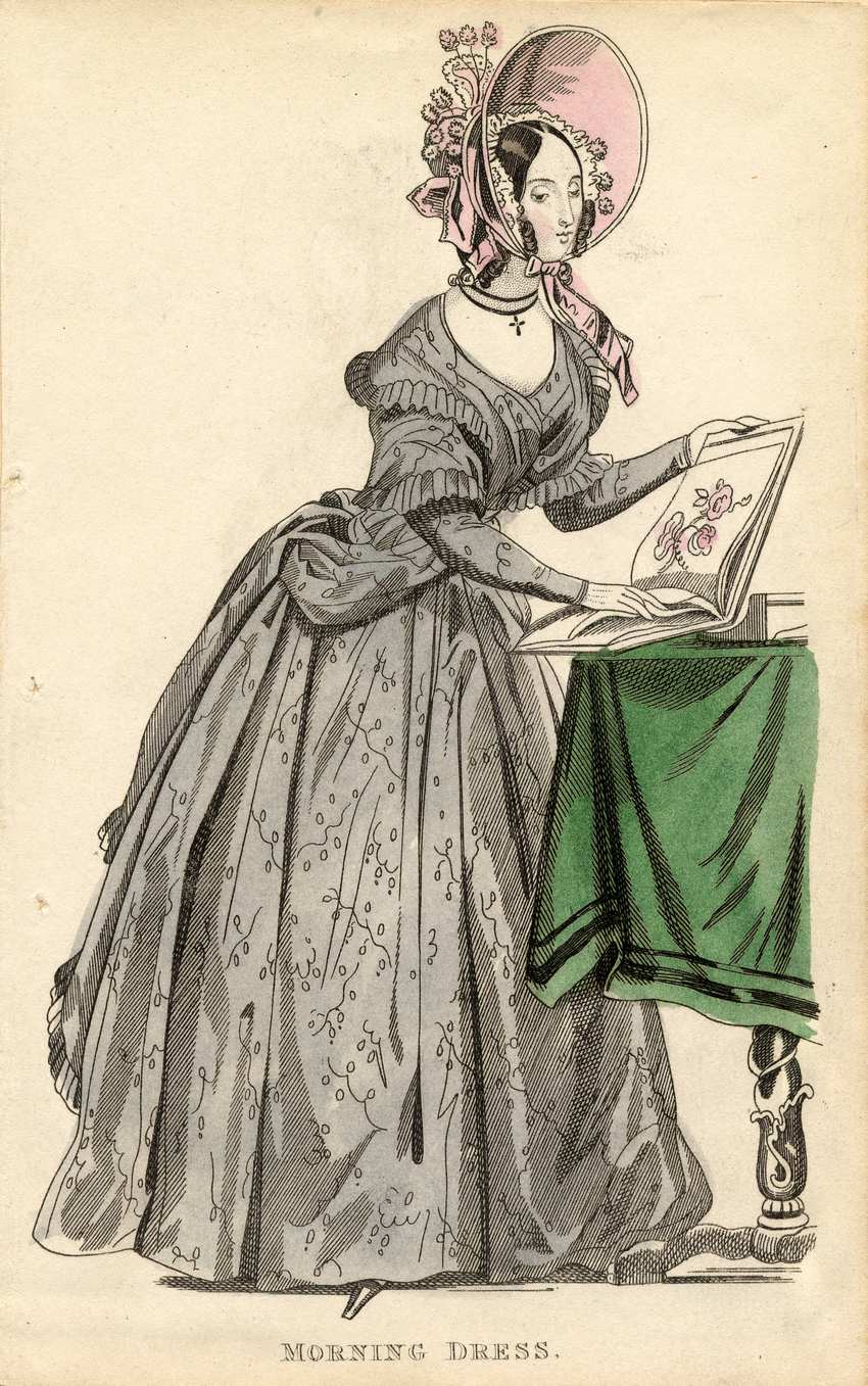 A woman stands in morning dress. She wears a pink bonnet with a wide brim, trimmed in white. The crown of the bonnet is decorated with pink ribbon bows, white lace and pink flowers. The ruffled edge of her mobcap in visible inside of the bonnet. Three pink flowers line the space inside of the brim. A pink ribbon is tied in a bow beneath her chin. She wears a double stranded, black cord choker with a cross on the bottom strand. Her dress is charcoal grey with a floral and dot design. The neckline is shaped like a “V”. Ruffles line the shoulders and upper arms of the dress. She wears black shoes and white gloves. The woman looks at a book and holds it open on a table. The table has carved legs and a dark green table cloth with black stripes around the hem.