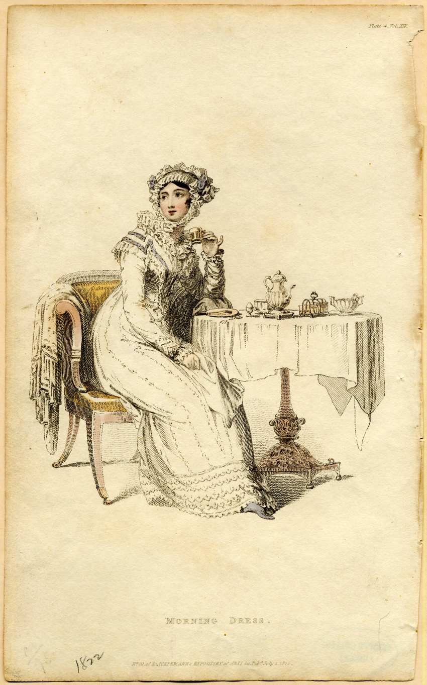 A woman wears a lacy, white morning dress as she breakfasts. Her sleeves are long and trimmed with lace. Vertical, lacy patterns run down the skirt in stripes, and the skirt is edged with five small rows of white lace. The dress has a high, lacy ruff as a collar, and more lace forms a vee that runs down the bodice and continues over the shoulder and down the back of the dress. This vee is set off with bands of purple ribbon. She wears a lacy, white mobcap, which has two purple bows and a lacy chin strap. The woman’s shoes and stockings are purple. She sits on a chair with high arms, upholstered in gold. A lacy, white shawl is thrown over one arm of the chair, which is pulled up to a round, pedestal table. The table is ornately carved and covered with a white cloth. A tea service has been set on the table, along with an egg in an egg cup, a plate cutlery, and a toast rack.