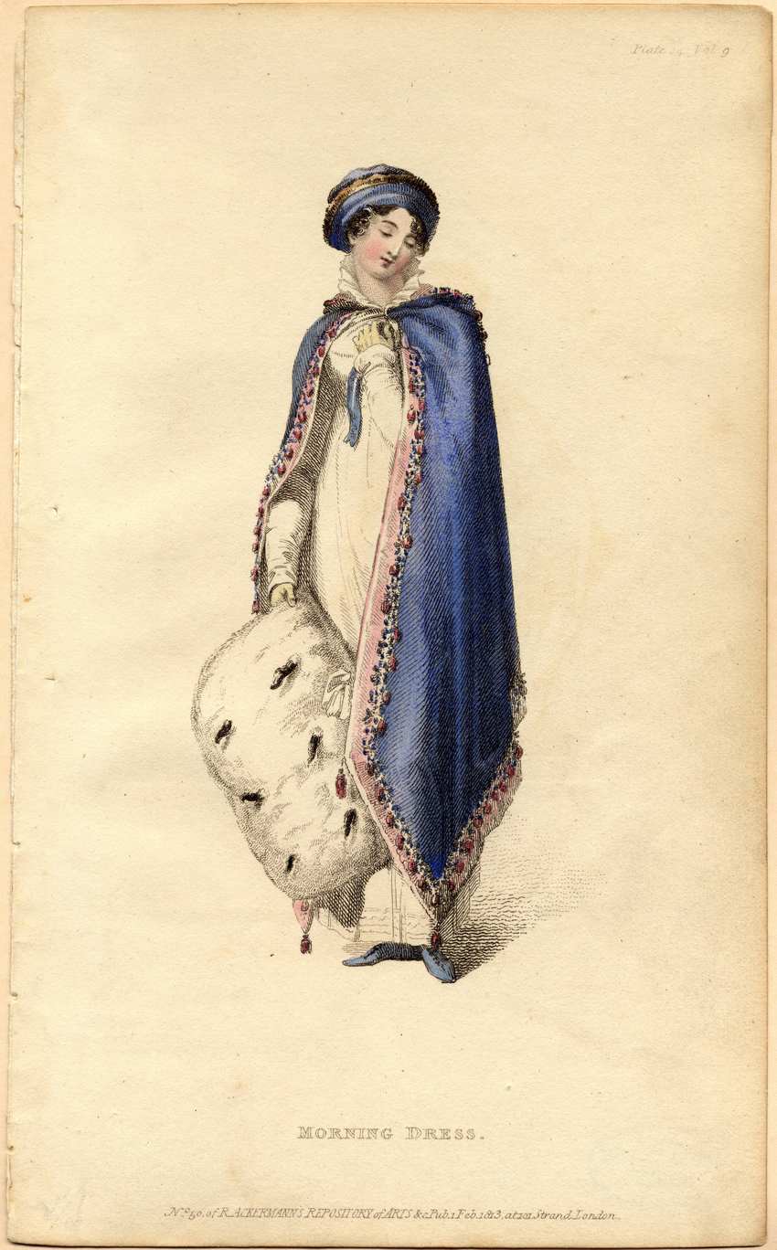 A woman wears a white, ankle-length morning dress with long sleeves, a high waist, and a high neck. The dress has a high, white standing ruffled collar with white detailing at the hem. The woman wears a long, blue cape with squared edges. The cape has a pink border trimmed with a garland of pink and blue flowers. It ties with a blue bow at the neck and has a pink tassel at each of the two lower points. The woman wears blue boots and buff-colored gloves. Her hat is round and blue with a band of brown fur. She adjusts her cape with her left hand, while her right hand holds a large white fur muff decorated with a white bow and tufts of black, probably ermine.