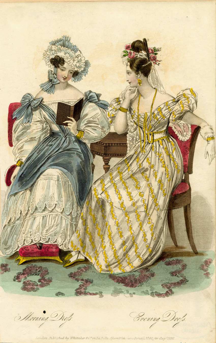 Two women wear a morning dress and an evening dress from 1831. The woman on the left wears a white dress with a blue apron. The white dress has sheer leg-of-mutton sleeves and has two tiers of wide scalloped lace at the hem. Her apron has straps that create a V-shape on her bodice and tie in bows at the shoulders. She wears a blue and white, ruffled lace cap that ties in a blue ribbon under her chin. She wears white gloves and wide gold bracelets on each wrist. She holds a brown book in her left hand. The woman on the right wears a long yellow dress with a pattern of diagonal lines of gold flowers, with short puffed sleeves. She wears a white and gold belt with a rectangular gold buckle. She wears gold shoes with bows and one white glove with a scalloped hem. She wears a gold bracelet around each wrist and a long gold bead necklace that is attached to the dress at the neck. She wears long, dangling, gold earrings. She wears her hair in a bun decorated with pearls, pink roses, and a large comb. A long, white lace veil hangs from the bun. She leans her right arm on the brown table next to her and drapes her left arm over the back of a red upholstered, brown wood chair. Her feet rest on a small red and gold footstool. They are sitting in a room with green carpet with a pink floral pattern.
