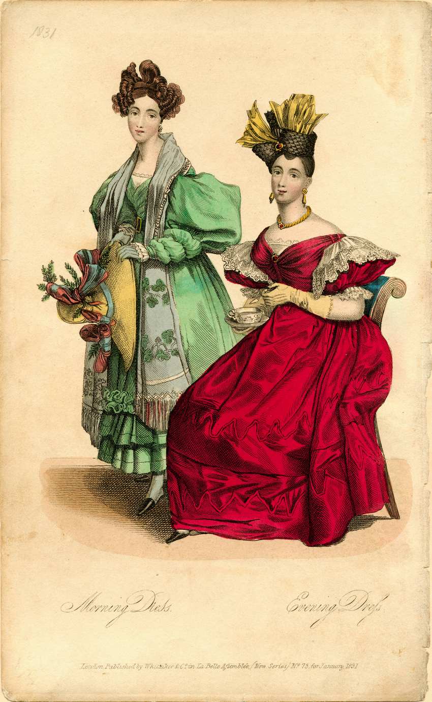 Two women appear in a morning dress and an evening dress. The woman on the right wears a red evening dress. The dress has a wide collar with the front of the bodice gathered into a V-shape with a ruby brooch. White lace under the bodice is visible in the collar. Wide white lace ruffles create epaulets at the shoulders. Her wide, short, puffed sleeves are similar to a lantern sleeve and a lace ruffle edges the bottoms. She wears black pointed shoes and yellow gloves. The rest of her dress is red with two rows of zigzag detailing at the hem and at the knee.