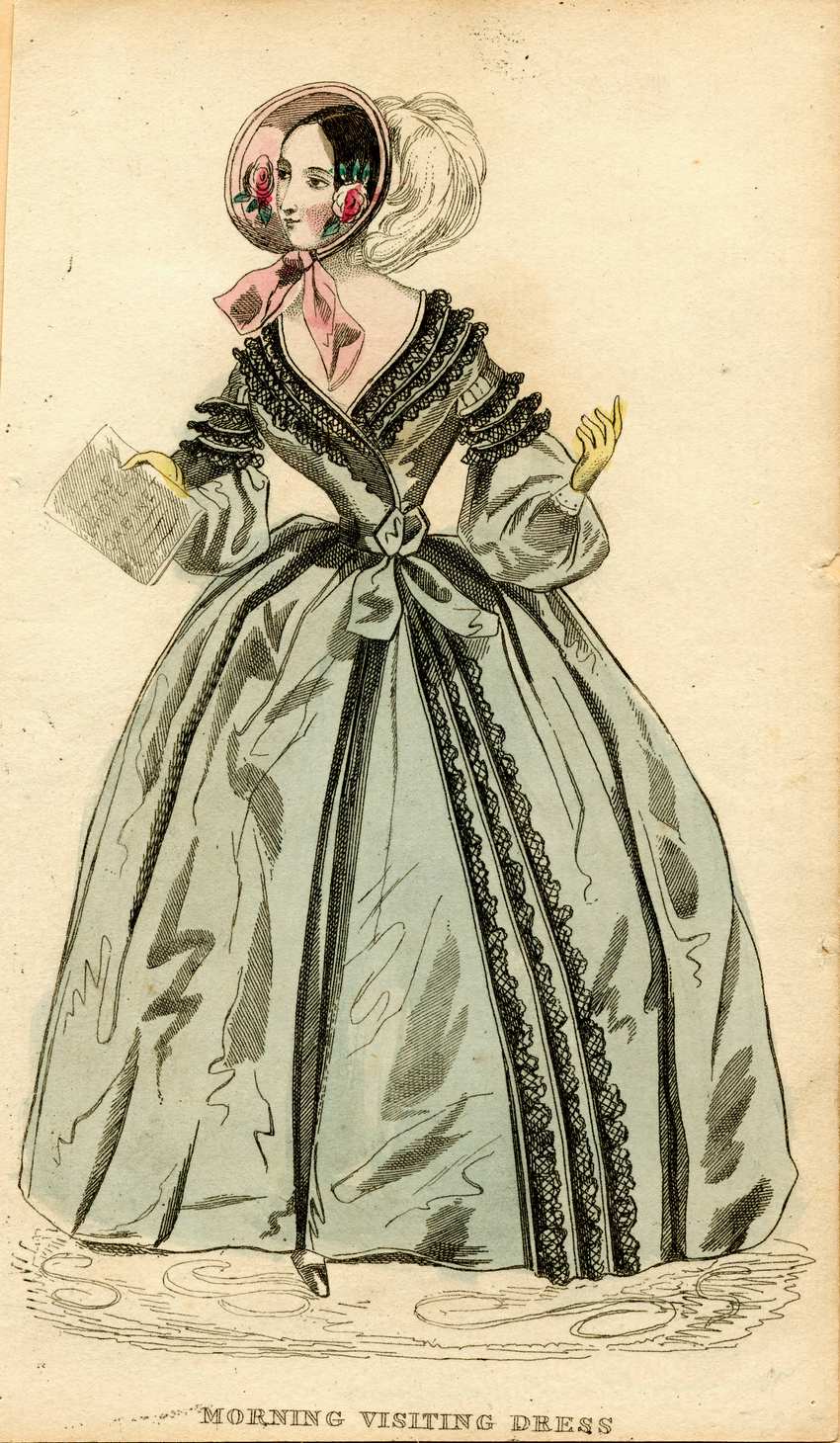 A woman in a morning visiting dress circa 1835. The woman wears a long gray-blue dress. The collar of the wrap bodice is edged with three rows of black lace ruffles. There are black ruffles below the shoulder and the lower part of the sleeves is wide and puffed. Three rows of the same lace run vertically down the dress, just to the left of the center, from the waistline to the hem. She wears yellow gloves and black shoes. She holds a small journal titled ‘The Ladies Cabinet’ in her right hand. She wears a pink bonnet with a pink ribbon and a large white feather in the back. She has two pink roses placed in her hair on either side of her face.