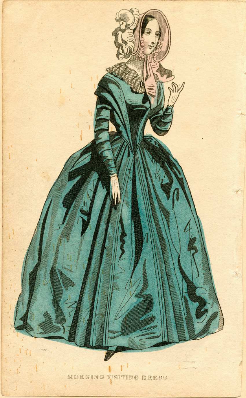 A woman wears a pink bonnet with large white plumes and pink flowers inside the brim. Her dress is green with long narrow sleeves with pleats down the sleeves, and narrow white lace ruffles at the cuff. The bodice is V-necked with pleats rising from the center front out over the shoulders, and has a wide ruffled lace or net collar with a brooch.