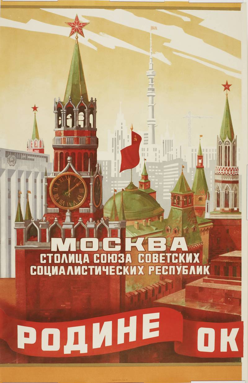 Poster depicts the Kremlin in Red Square and other buildings from Moscow. Written in a banner at the bottom of the poster, “Motherhood of October”, a reference to the October Revolution.