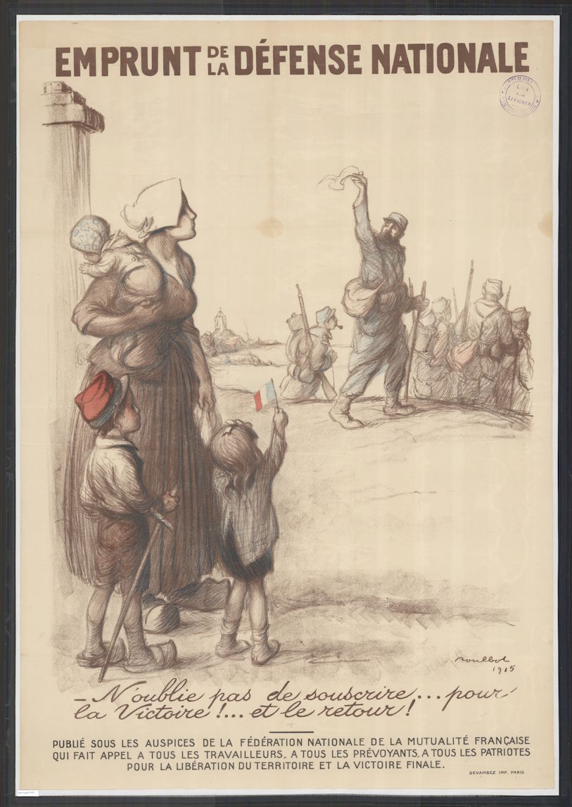 National Defense Loan: don’t forget to subscribe… for victory! … and the return. Woman with three children (small girl holding french flag, small boy has wooden sword) looking at soldiers, one soldier waving at the woman and children.