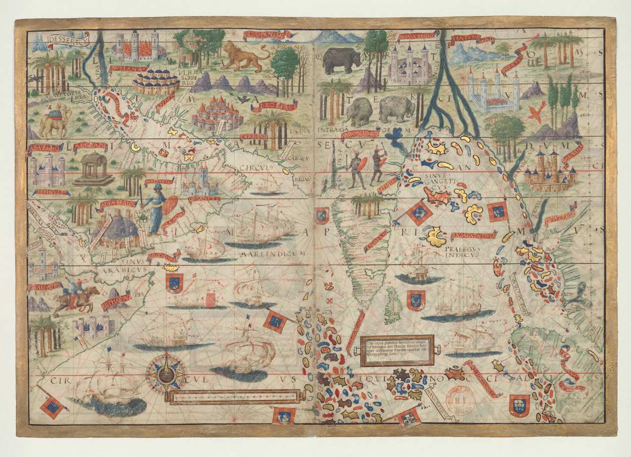 The map presented here is from the Miller Atlas in the collections of the National Library of France. Produced for King Manuel I of Portugal in 1519 by cartographers Pedro Reinel, his son Jorge Reinel, and Lopo Homem and miniaturist António de Holanda, the atlas contains eight maps on six loose sheets, painted on both sides.
