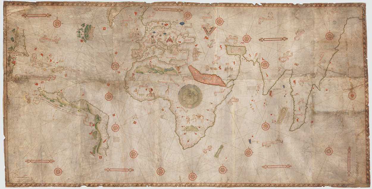 Coasts are ringed in green, islands with flat tints usually in gold, occasionally in red or blue. The Red Sea is streaked in red. There is schematic representation of some rivers in blue. In Africa, marking the center of the system of rhumbs is a small circular globe surrounded by the seven heavens, which is reminiscent of the one on the map attributed to Christopher Columbus, whose sketching of the coasts is more archaic than that on this planisphere.